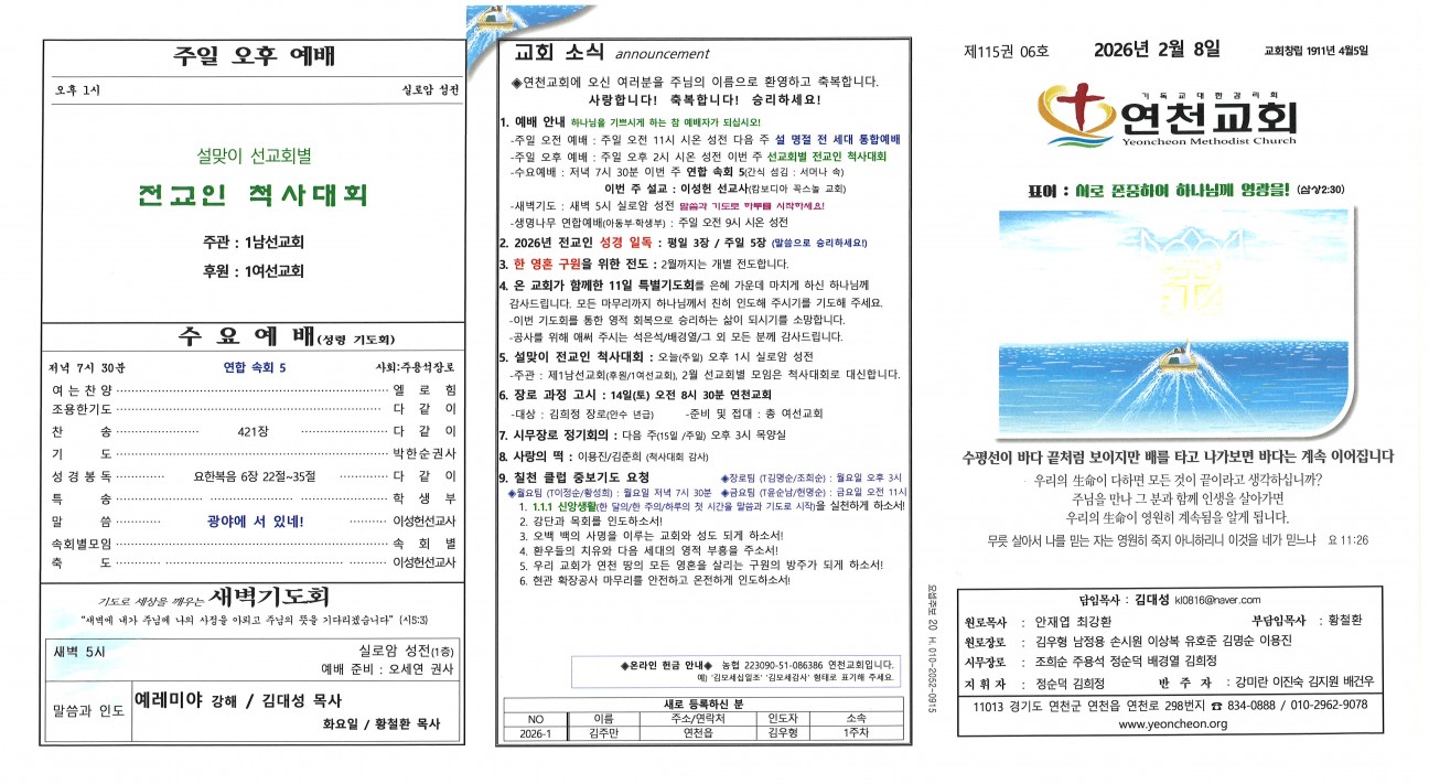 2026년 2월 8일 교회주보 본문 2026년 2월 8일 교회주보2026년 2월 8일 교회주보 샬롬 연천교회 조회 3회 2026-02-07 10:48 목록 댓글목록 다음글 2026년 2월 1일 교회주보 26.01.31